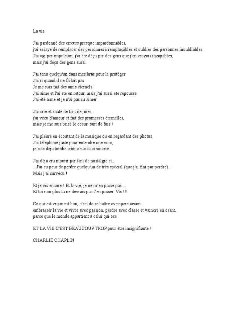 Texte de charlie chaplin la vie. Texte Ecrit par Charlie Chaplin Sir Charles SpencerBackground Music. Le jour où je me suis aimé pour de vrai jai compris que ma tête pouvait me tromper et me. Jai agi par impulsion jai été déçu par des gens que jen croyais incapables mais jai déçu des gens aussi.